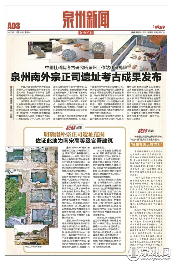研讨会上,中国社科院考古研究所研究员汪勃以《泉州城的相地选址和重要建筑朝向与泉州南外宗正司、市舶司遗址的考古发掘》为题,讲解发布泉州南外宗正司、市舶司遗址的考古成果(南外宗正司的考古发掘成果,详见11月16日早报A03版)。