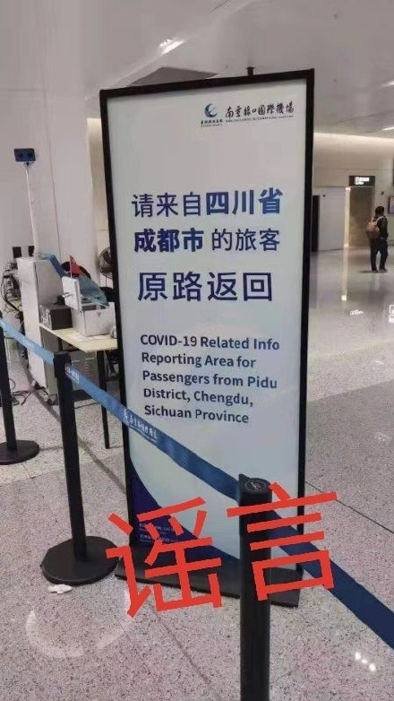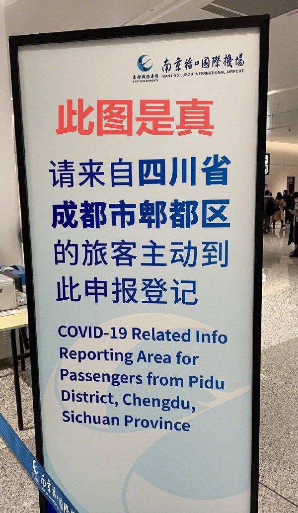 然而,12日在南京禄口国际机场下飞机的旅客表示,该标识牌上显示的内容为“请来自四川省成都市郫都区的旅客主动到此申报登记”,并非是网上流传的“请来自四川省成都市的游客原路返回”。