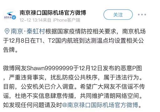 对此,南京禄口国际机场官方微博发布辟谣声明