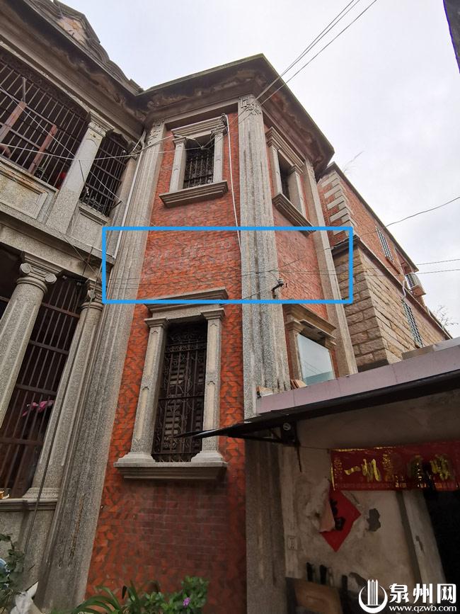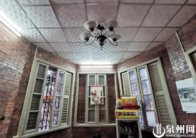 洋楼一层两侧楼顶处,有明显的白色痕迹(如图所示),黄嫦娥回忆说,在城南防洪堤未建成前,古城经常淹水,其中1956年发大水,很多泉州人都还有印象,当年的大水,从中山南路一直淹到钟楼,西街西段也淹水,水淹到八角楼一楼楼顶的位置,附近很多街坊都来楼上避灾,记得当时在二楼直接用水桶打水,烧开后使用。一个月左右的大水过后,洋楼就留下了水泡过的痕迹,如今这些痕迹,成为中山路和西街淹大水的珍贵记录。
