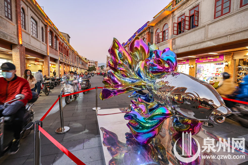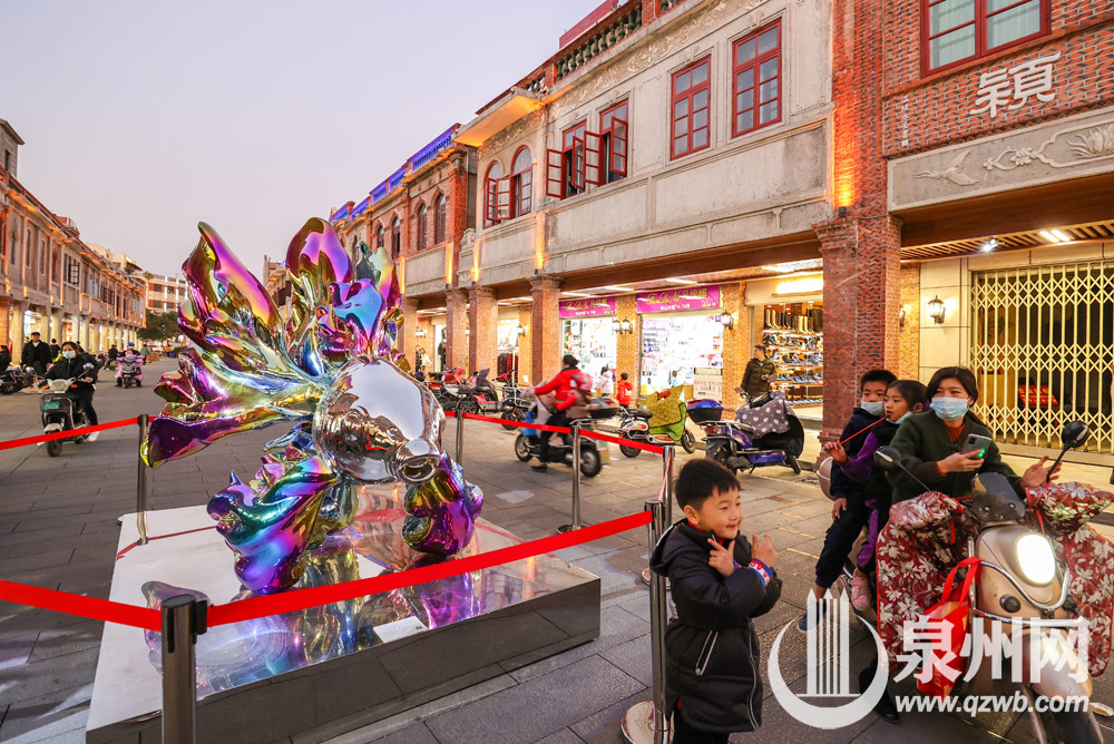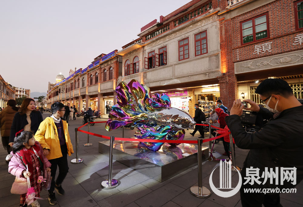 1月1日,泉州中山路金鱼巷附近,一尊不锈钢的鲤鱼巨型雕塑摆在街头甚是显眼。据悉,该雕塑名为“再生鲤鱼”,由艺术家高孝午制作,雕像高约3米,其系列作品以自然界的飞潜动植物为主题形象,意在通过“再生”幻化出来的美丽,唤醒人们对自然的憧憬。在这个辞旧迎新之际,再生将启迪我们重新看待生命的意义。(陈英杰摄影)