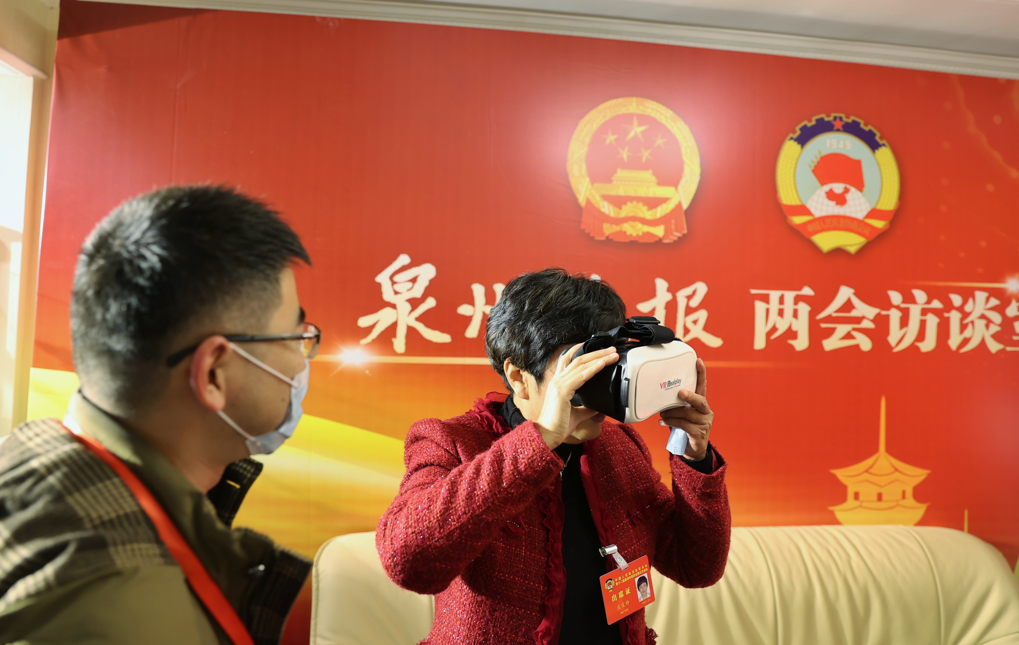 在泉州晚报“两会访谈室”,市政协委员用VR眼镜观看VR两会报道。(林劲峰摄)