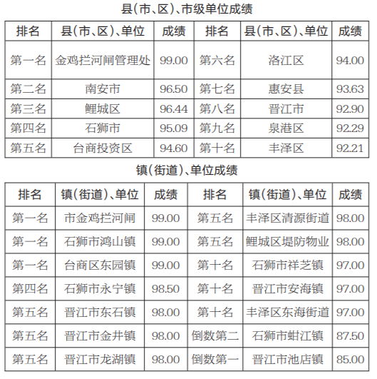 泉州网1月25日讯(记者吴志明 通讯员郑培嵘)去年12月份,市城市管理综合考评中心对全市海岸带(近岸海域和海岸线向陆一侧200米的陆域)和晋江入海口至金鸡拦河闸上游100米的晋江河道环境卫生情况进行考评。其中,在各县(市、区)、市级单位中,金鸡拦河闸管理处再次夺魁,丰泽区倒数第一。而从各镇(街道)、单位成绩来看,市金鸡拦河闸、石狮市鸿山镇、台商区东园镇并列第一,晋江市池店镇倒数第一,石狮市蚶江镇倒数第二。