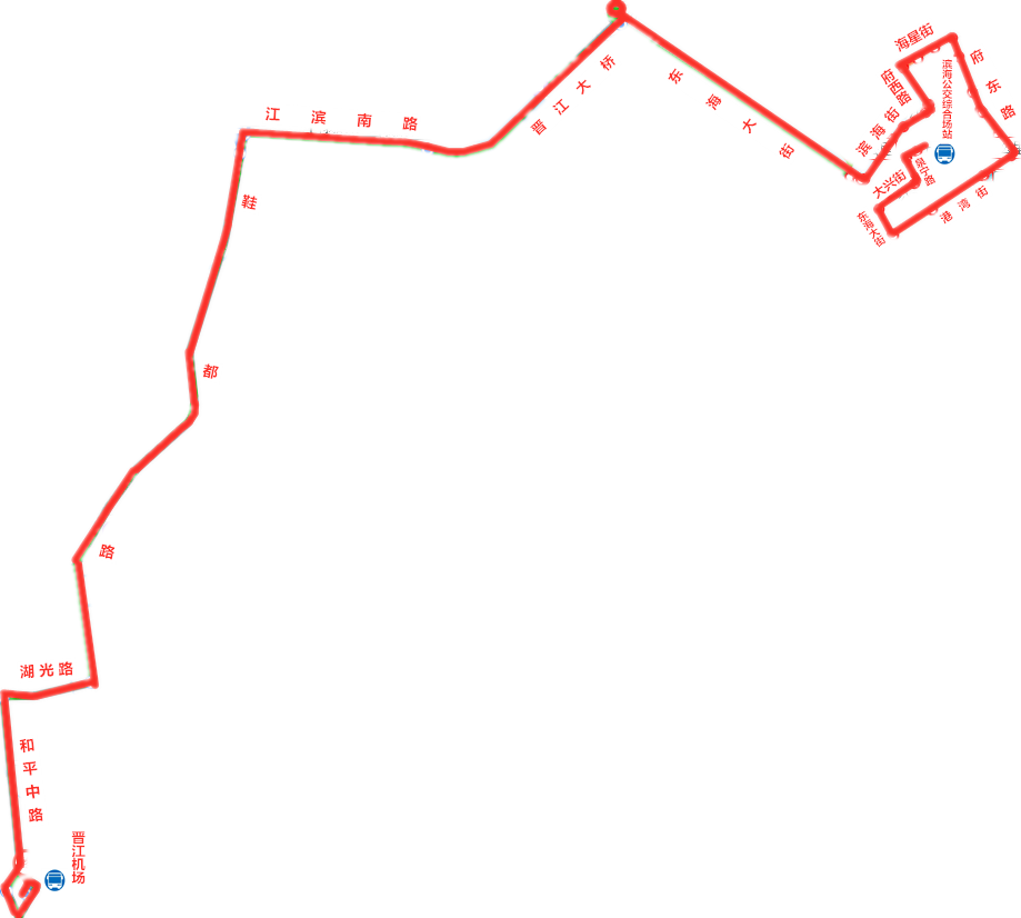 滨海公交站-泉宁路(泉宁路北段)-大兴街(大兴街西段)-东海大街(东海大街南段)-港湾街(港湾街西段、港湾街中段、港湾街东段)-府东路(港湾街路口、市图书馆、府东路南段)-海星街(泉州行政中心)-府西路(府西路)-滨海街(东海大街口)-东海大街(泉州师院、东海大街东段、东海大街中段、医大二院东海院区、东海滨城)-晋江大桥-江滨南路(万宝路口)-鞋都路(滨江管委会、庵上路口、洋埭路口、鞋都路北站、横坂路口、横坂许村、涵口路口<晋江古玩城>、陈埭鞋都<紫峰中学>、七一路口)-湖光路(湖中桥、湖中环岛)-和平中路(青华环岛、阳光酒店、阳光天桥<时代广场>、厦航大厦)-泉州晋江国际机场。