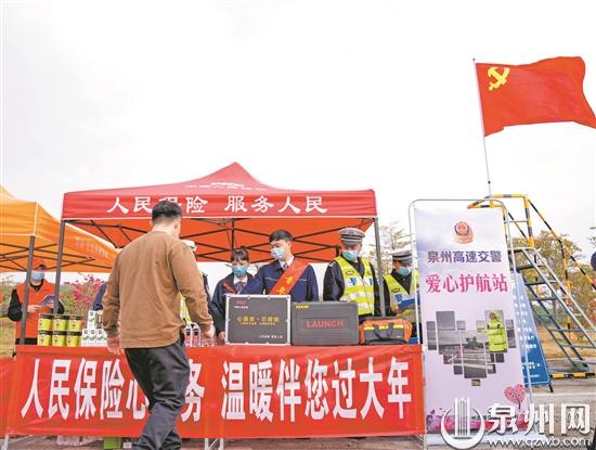 此次春运,泉州高速交警支队联合保险协会在各站点设立警保联动爱心服务站,免费为过往司乘人员提供热茶、便民物资、急救药箱、消毒酒精、口罩、车辆检测等暖心服务,发放文明出行倡议书及疫情防控宣传单,传递文明出行正能量。