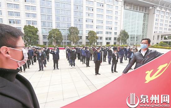 去年2月,市纪委监委疫情防控驻村工作队全体成员面向党旗重温入党誓词。(张九强 摄)