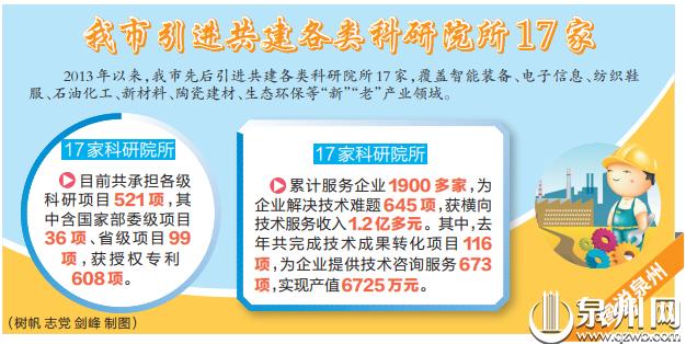 “围绕产业链布局创新链,我们要求一个主导产业至少创建一个科研创新平台。”市科技局创新平台与成果转化科科长吴志云告诉记者,2013年以来,泉州先后引进共建各类科研院所17家,覆盖智能装备、电子信息、纺织鞋服、石油化工、新材料、陶瓷建材、生态环保等“新”“老”产业领域。