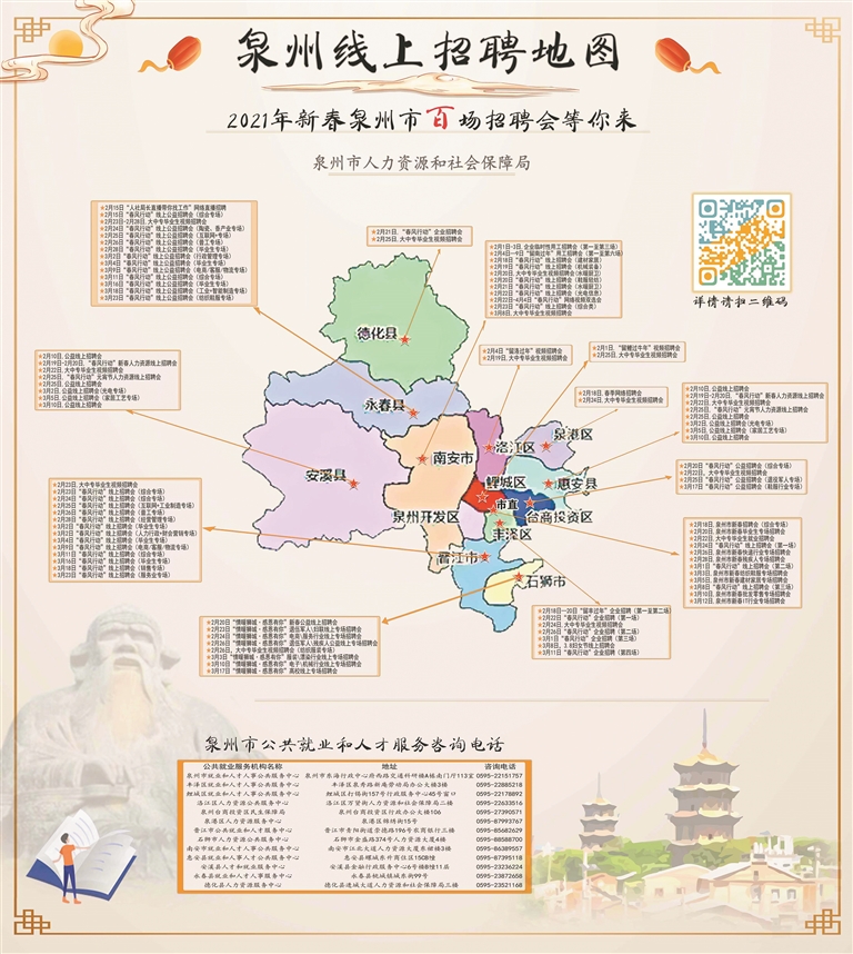 泉州网2月9日讯 (记者许奕梅 通讯员黄泽鑫)记者从泉州市人社局了解到,为构建“互联网+就业”新模式,打造双向选择交流平台,泉州市人社局会同有关行业主管部门、各县(市、区)组织开展2021年新春线上招聘工作,以推进“1+3”(绘制1张“新春百场线上招聘地图”,开展综合线上招聘会、农民工线上招聘会、高校毕业生线上招聘会三大类招聘会)为着力点,精准服务企业用工和求职者就业。