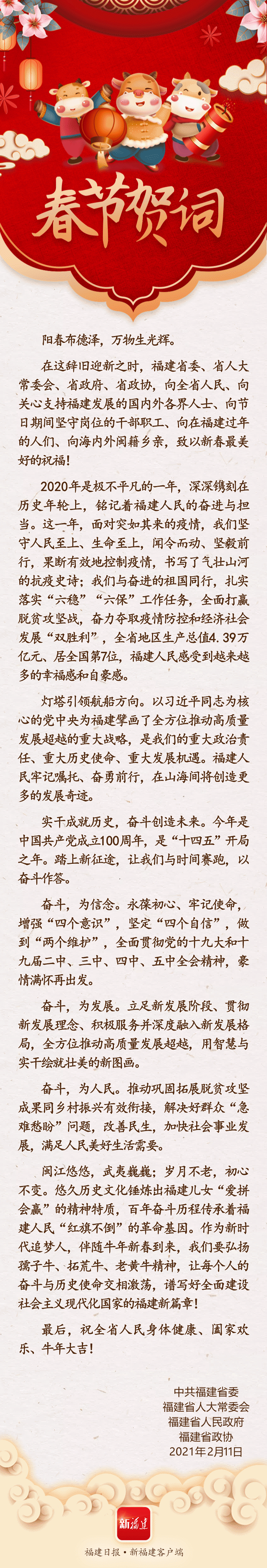 福建省委、省人大常委会、省政府、省政协,向全省人民、向关心支持福建发展的国内外各界人士、向节日期间坚守岗位的干部职工、向在福建过年的人们、向海内外闽籍乡亲,致以新春最美好的祝福!