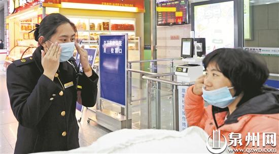 泉州动车站工作人员(左)劝导旅客佩戴好口罩
