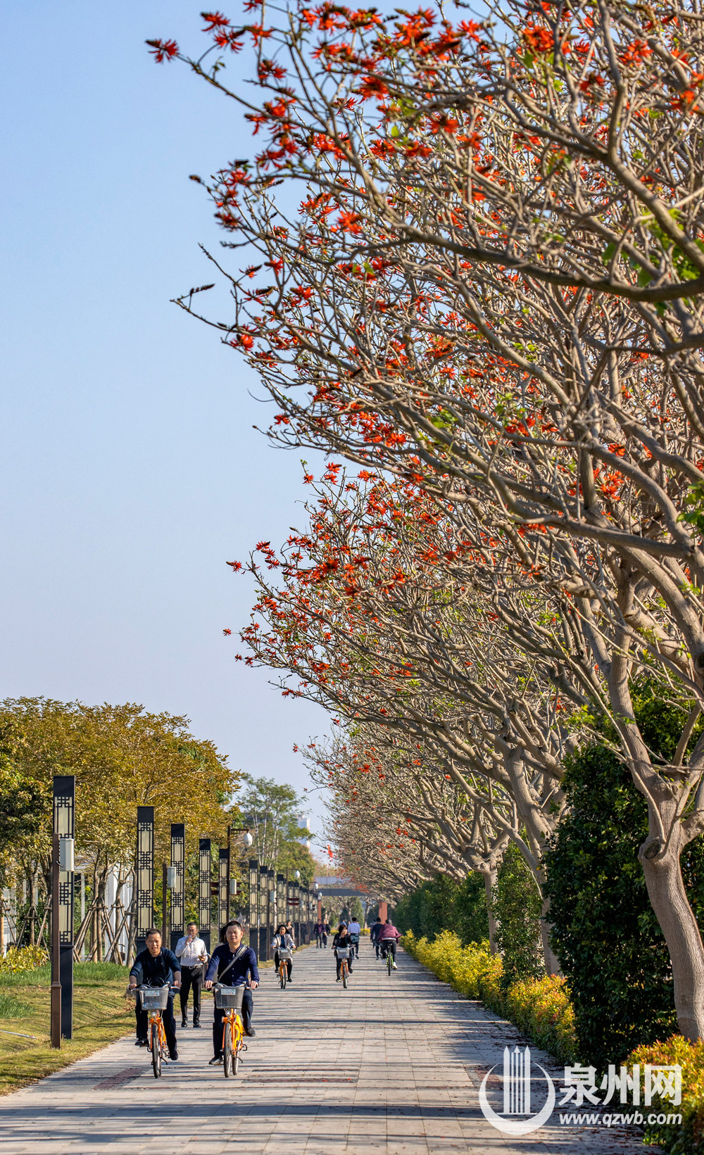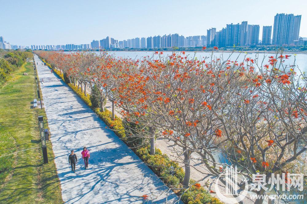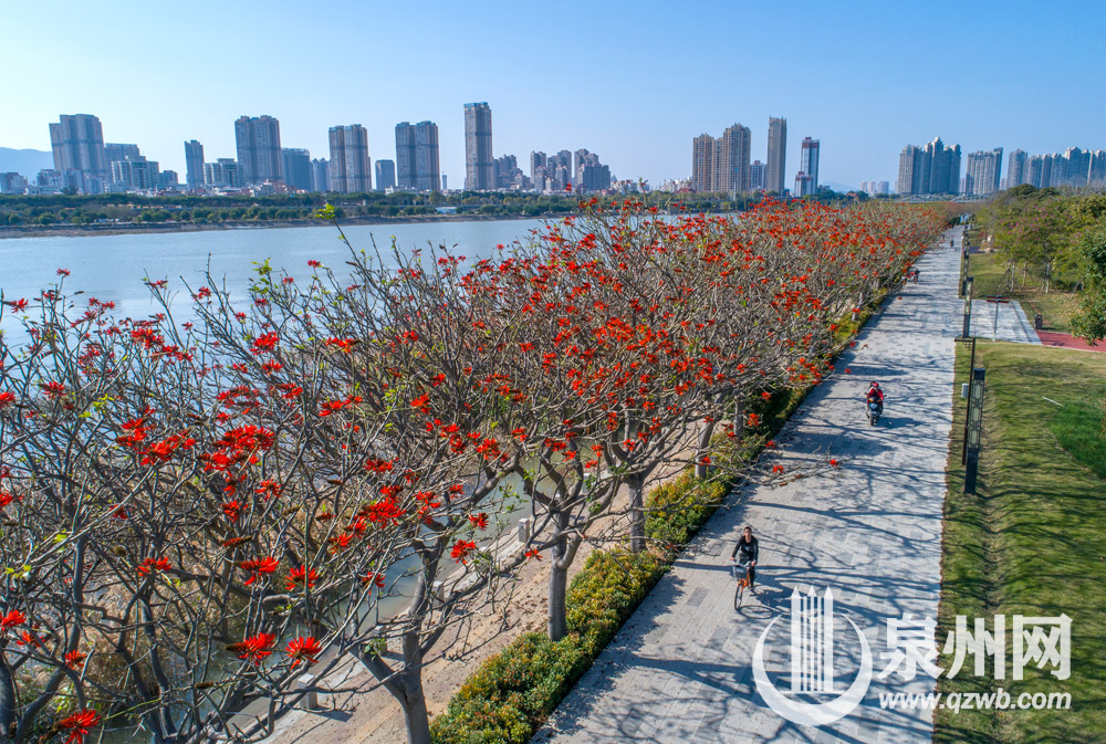 春风拂面,刺桐花开。泉州市区北滨江公园笋浯园至笋江园的刺桐大道上,刺桐花竞相开放,火红的花朵“点燃”枝头,成为晋江母亲河边上的靓丽风景。图为2月15日下午拍摄的画面。(陈起拓 陈淑华 摄)