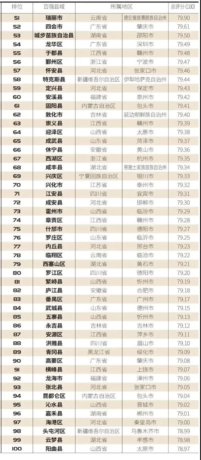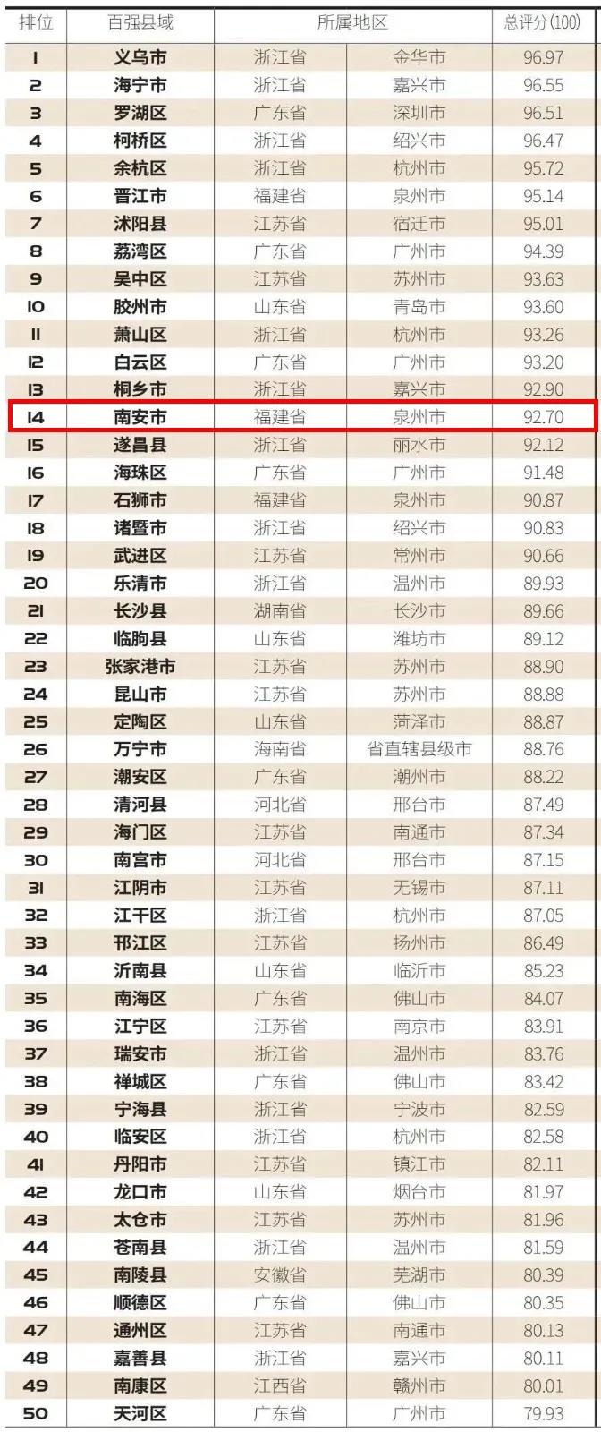 榜单结果显示,浙江省金华市义乌市、浙江省嘉兴市海宁市、广东省深圳市罗湖区名列前三,泉州市晋江市(第6位),泉州市南安市(第14位),泉州市石狮市(第17位),泉州市安溪县(第60位)、漳州市龙海市(第92位)。