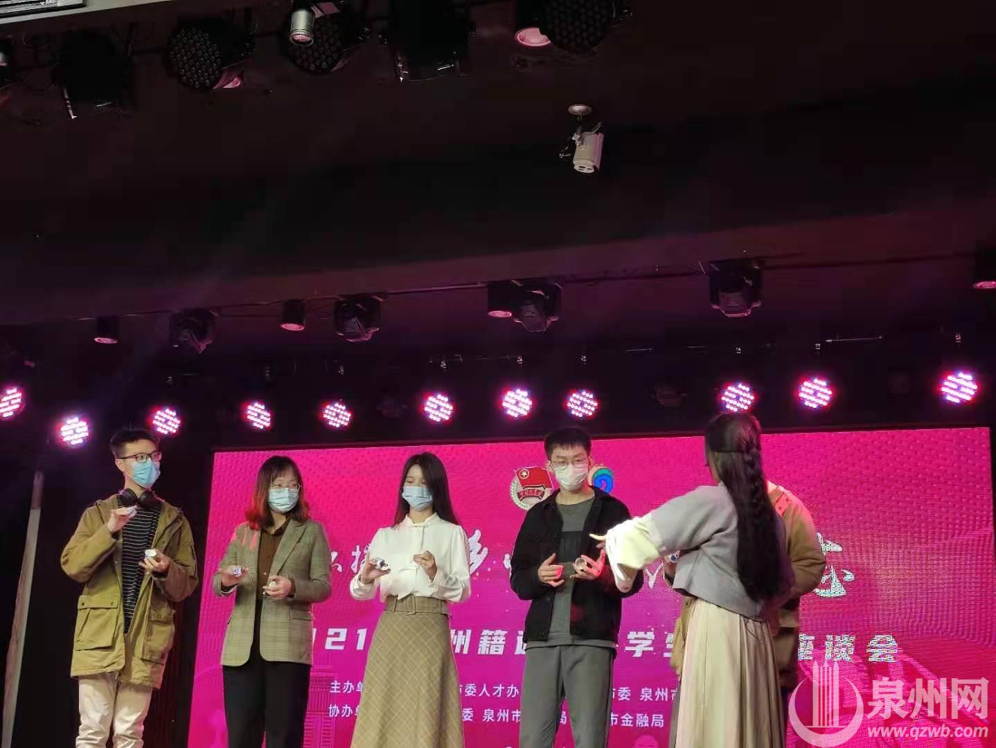 在座谈会上,泉州市人社局专家和引智工作科、就业和人才人事公共服务中心对泉州引进人才政策、就业创业形势进行全面深入的介绍;福建省工科类青年人才、泉州市昭园文化发展有限公司总经理李灿昭,晋江市舔筒食品有限公司总经理、冰胶囊品牌创始人陈国杰,泉州鼎呱呱网络科技有限公司CEO李旭珊等回泉创业的往届泉籍在外大学生代表分享了职业生涯规划和投身家乡建设的心得。