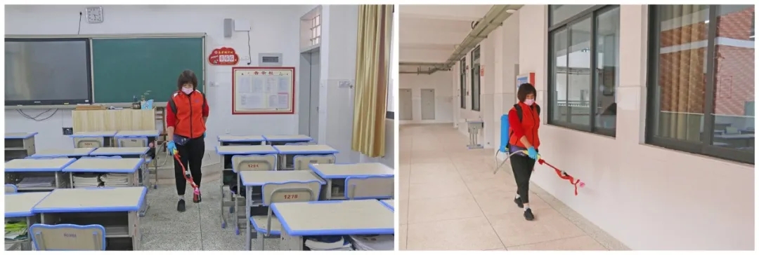 同时,学校也按照要求,每天在全校范围内进行消杀,只见校园保洁员背着装有消毒液的设备不停地忙碌着,每个教室、走廊、卫生间、小水沟……都喷洒上了消毒液,不留死角,确保以干净整洁的环境迎接学生开学。