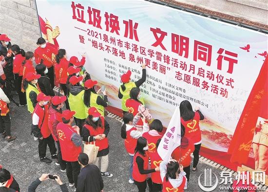 泉州网3月6日讯 (记者林福龙 张金华 王柏峰 吴嘉晓 胡彦明 实习生林灿鑫 文/图)“学习雷锋好榜样……”昨日下午3点,随着志愿者们激昂的歌声在山线绿道萦绕,现场气氛顿时被点燃,在大家热烈的掌声中,“垃圾换水 文明同行”暨“烟头不落地 泉州更美丽”志愿服务活动拉开了帷幕。本次志愿活动共有24支志愿队伍参与。近百名志愿者齐聚山线绿道,在签名墙上郑重签字,一切助力泉州文明城市创建。
