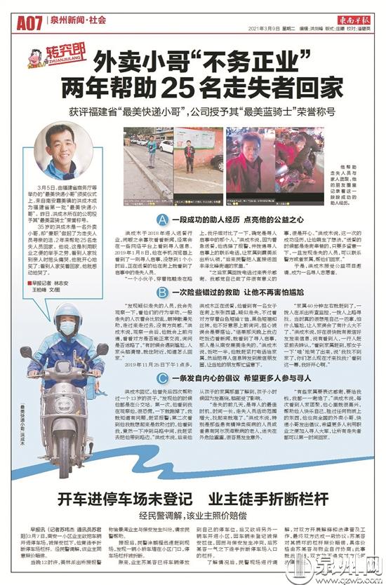 9日,东南早报A07版报道,家住南安霞美镇的外卖小哥洪成木,在两年的时间里,利用走街串巷的职业之便,及时发现并帮助了25名走失者回家。因为这样的“不务正业”,洪成木获评福建省第一批“最美快递小哥”,并被公司授予“最美蓝骑士”荣誉称号。