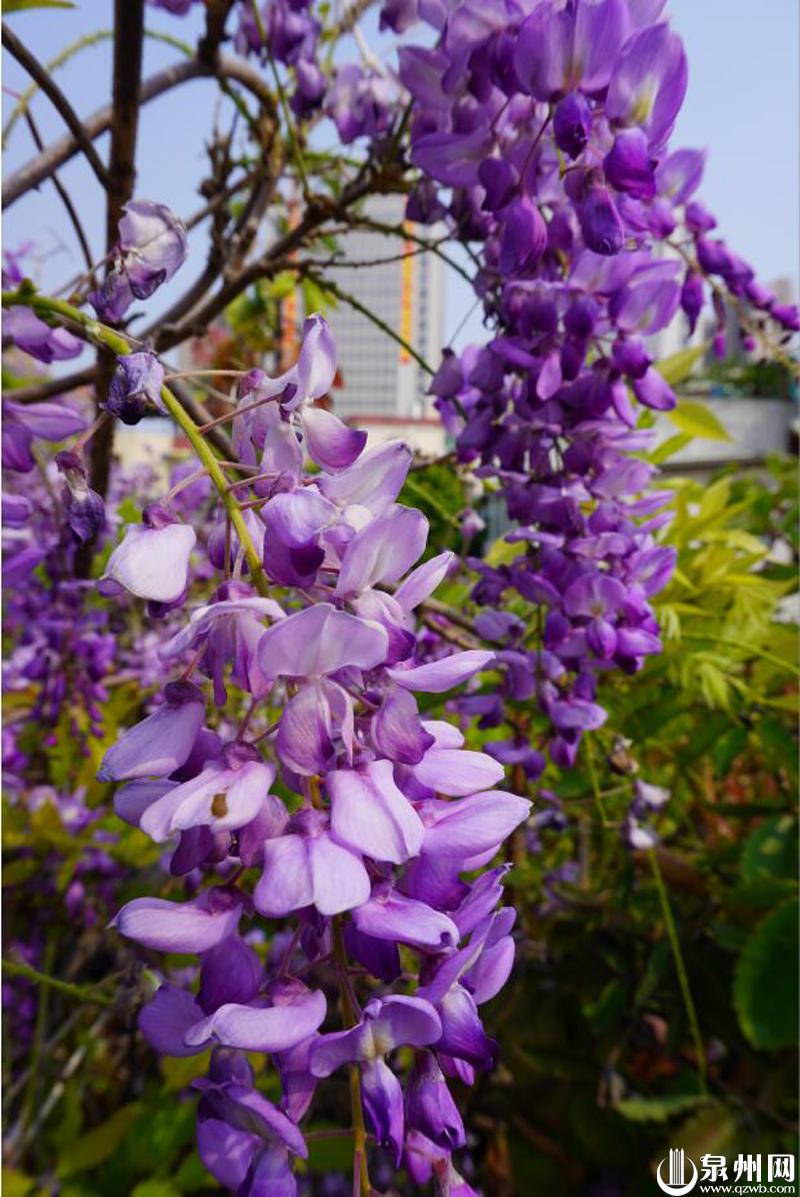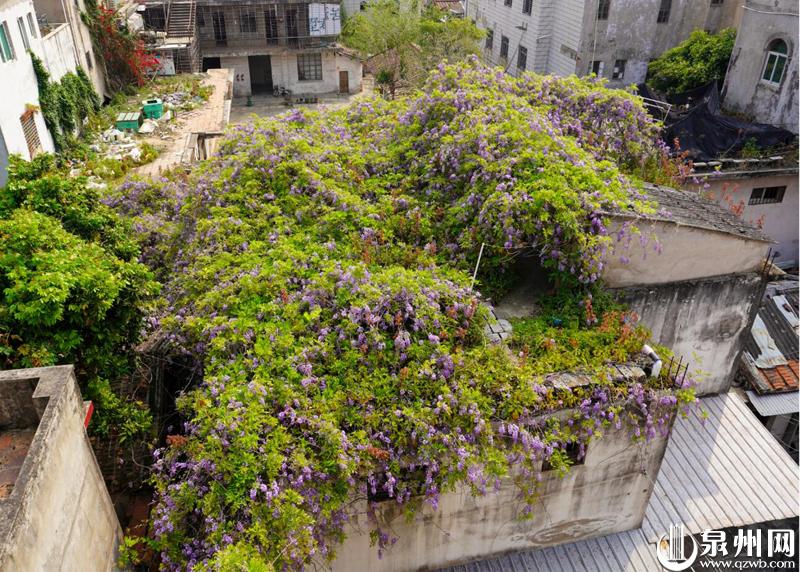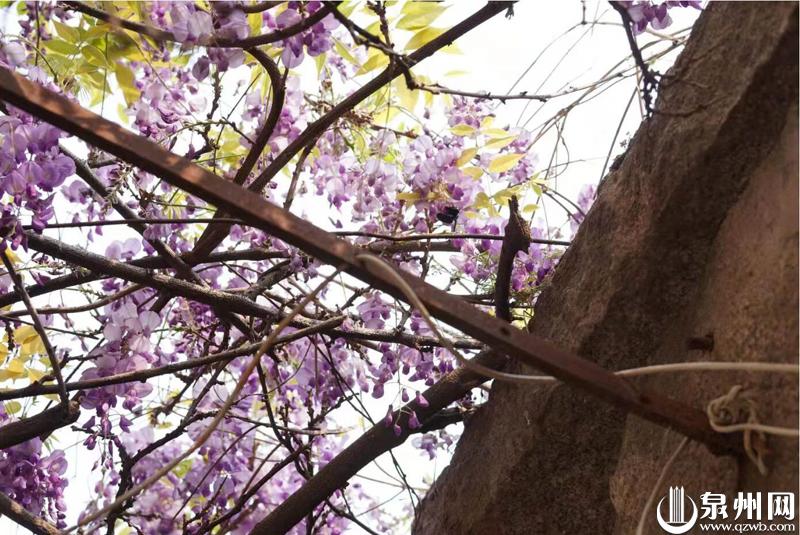 泉州网3月19日讯(记者 王了 文/图)紫藤挂云木,花蔓宜阳春。密叶隐歌鸟,香风留美人。这是大诗人李白的《紫藤树》,紫藤花因为花势宏大,姿态优美,深受中国历代文人墨客喜爱。这几天,当年泉州著名画家李硕卿手植的一株紫藤花盛开,通源巷内一片似锦繁花,将小巷点缀得格外美丽。
