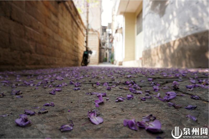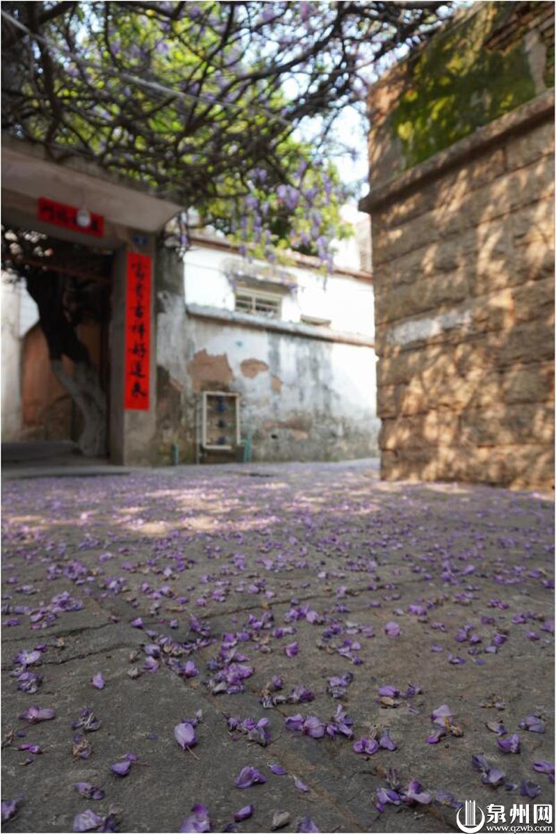通源巷内,阳光从紫藤花藤打下来,落在满地紫色花朵上。