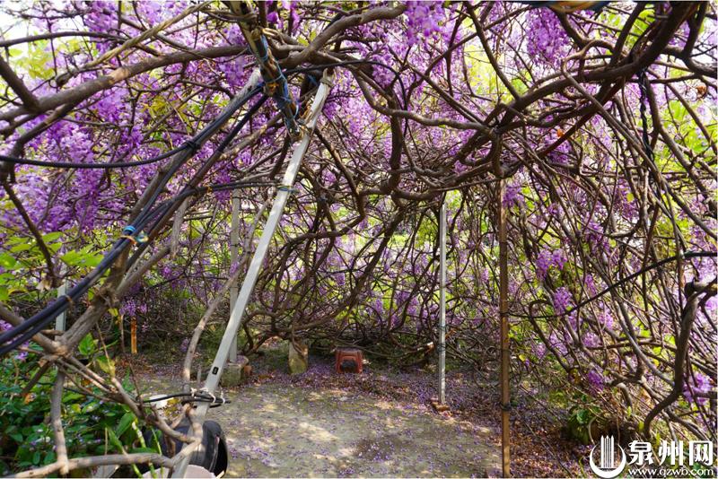 二楼楼顶,这株紫藤花搭成了花间小道。