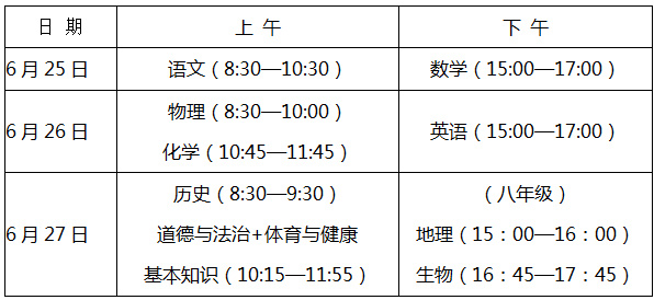 2021年中考省级统一考试安排在6月25日-27日举行。语文、数学、英语、道德与法治、历史、地理、物理、化学、生物等9个科目及体育与健康基本知识考试实行省级统一考试,全部实行书面闭卷笔试形式。其中,道德与法治科目、体育与健康基本知识考试同场合卷进行。各学科考试命题以教育部初中学科课程标准为命题依据。体育与健康科目中的“身体素质和运动技能”的测试由市教育局组织实施,安排在4月上旬至5月中旬进行。往届生须重新参加升学体育考试,体育与健康考试成绩当年有效。全市初中音乐、美术、信息技术和物理、化学、生物实验操作合格性考试时间统一安排于2021年5月份举行,报市教育局核准后由各县(市、区)教育局组织实施。