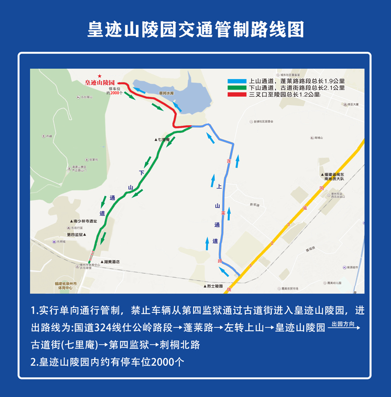管制期间,皇迹山陵园周边道路由国道324线→蓬莱路(冠亚凯旋门边)→新埔街→皇迹山陵园→古道街(七里庵)→第四监狱→刺桐北路实行单向行驶,严禁车辆逆向行驶。