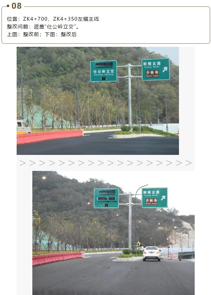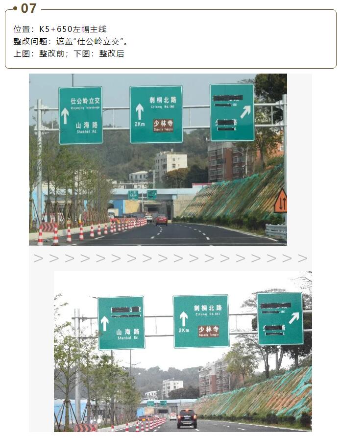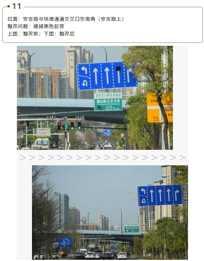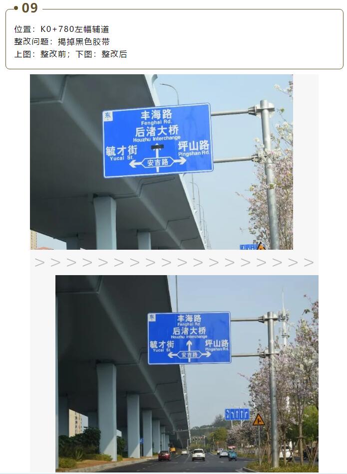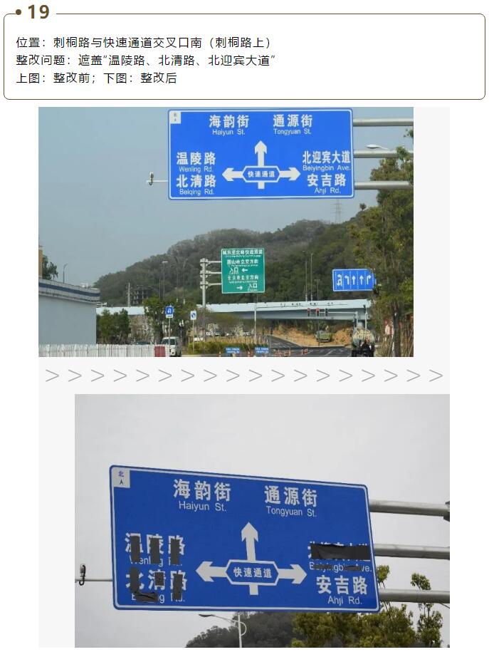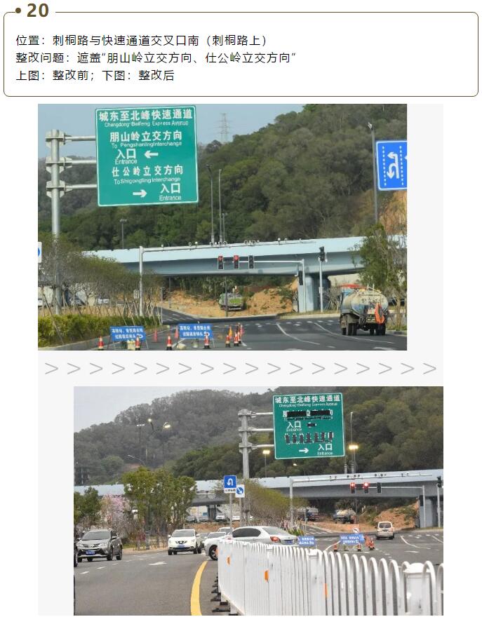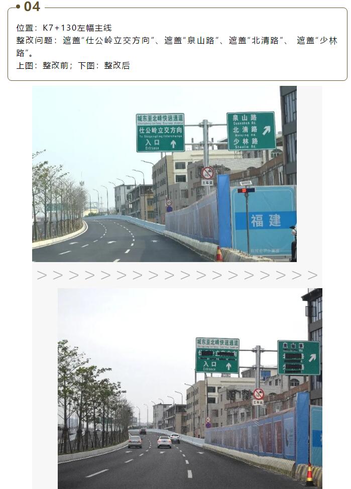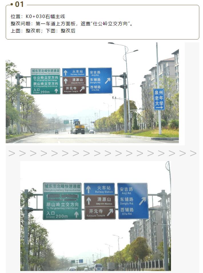 针对市民反映的问题,泉州市城东至北峰快速通道项目建设指挥部高度重视,立即组织建设单位、施工单位对快速通道全线的标识标牌进行逐一排查,并与交警部门充分沟通,根据现场实际情况对全线23处标识标牌的内容进行了整改,整改措施主要是对标识标牌上未开通道路的名称进行遮盖、对已开通道路的名称的遮盖揭开。具体每处整改情况详见下方整改示意图所示。