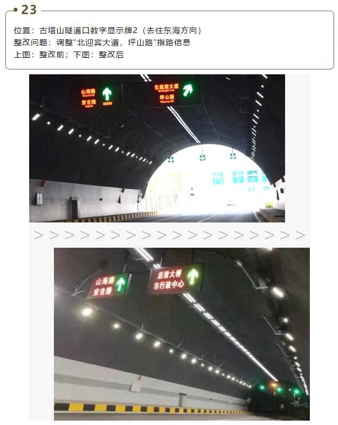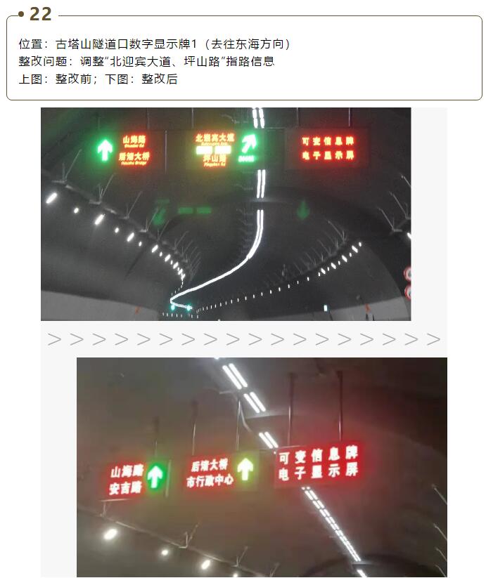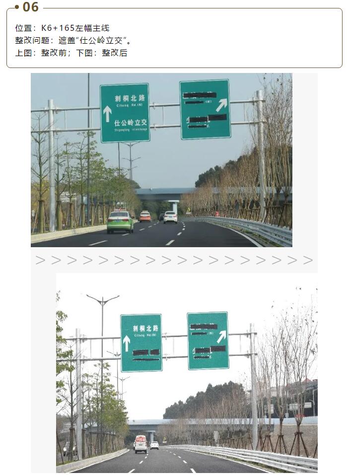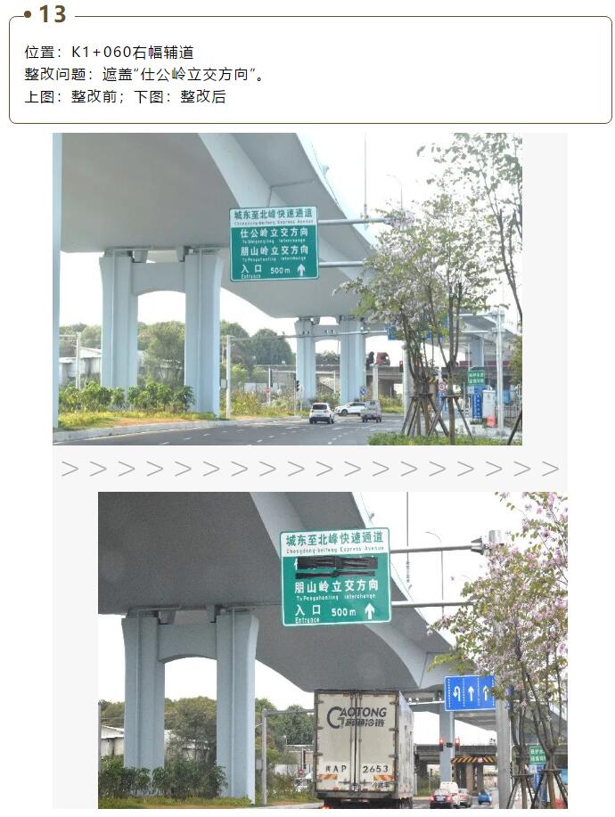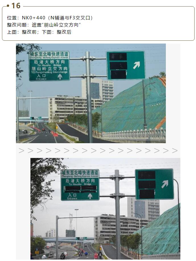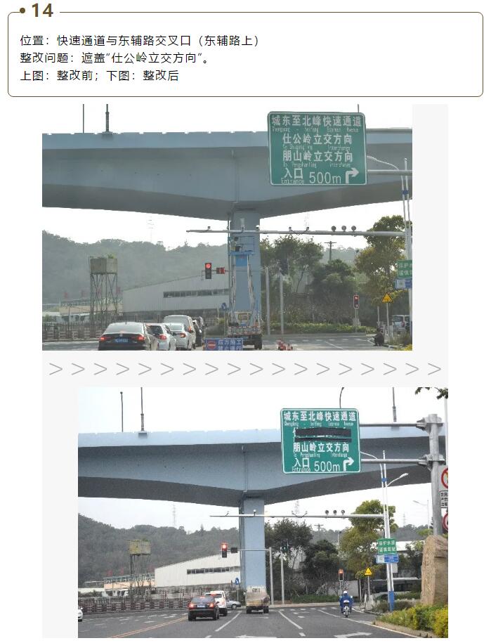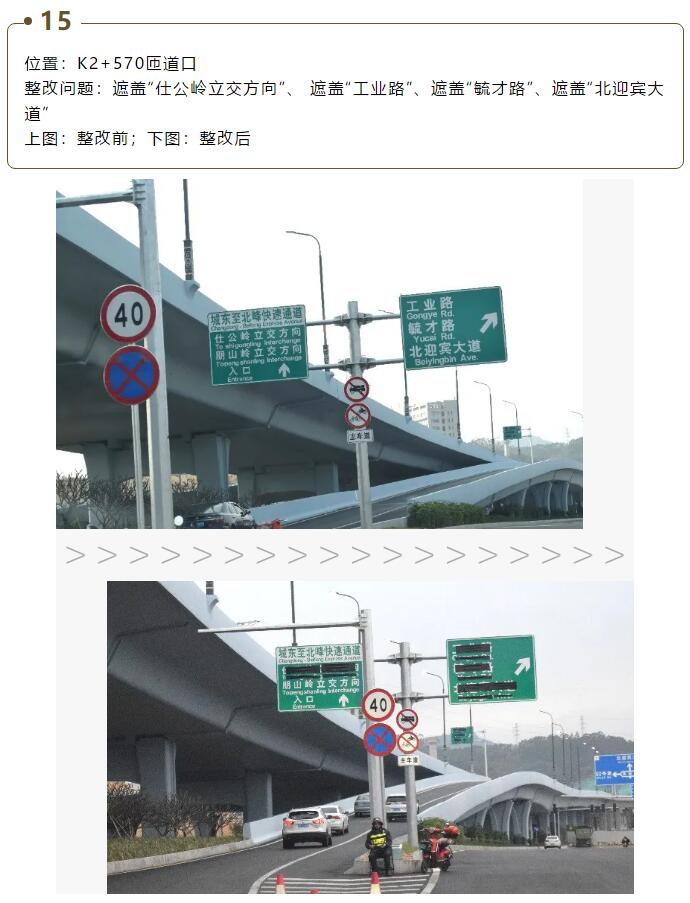 针对市民反映的问题,泉州市城东至北峰快速通道项目建设指挥部高度重视,立即组织建设单位、施工单位对快速通道全线的标识标牌进行逐一排查,并与交警部门充分沟通,根据现场实际情况对全线23处标识标牌的内容进行了整改,整改措施主要是对标识标牌上未开通道路的名称进行遮盖、对已开通道路的名称的遮盖揭开。具体每处整改情况详见下方整改示意图所示。