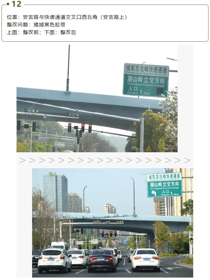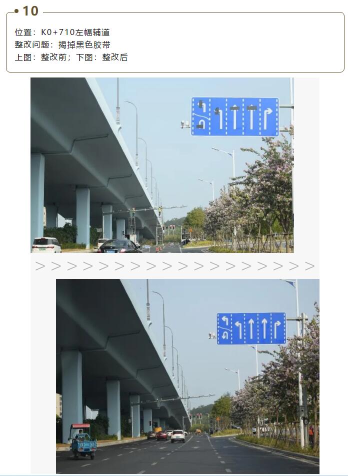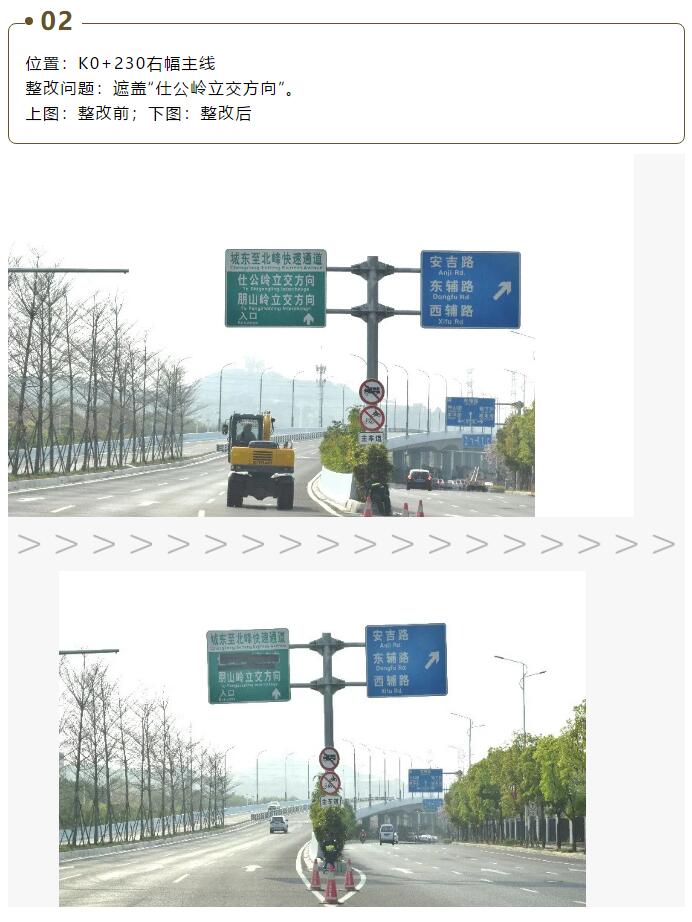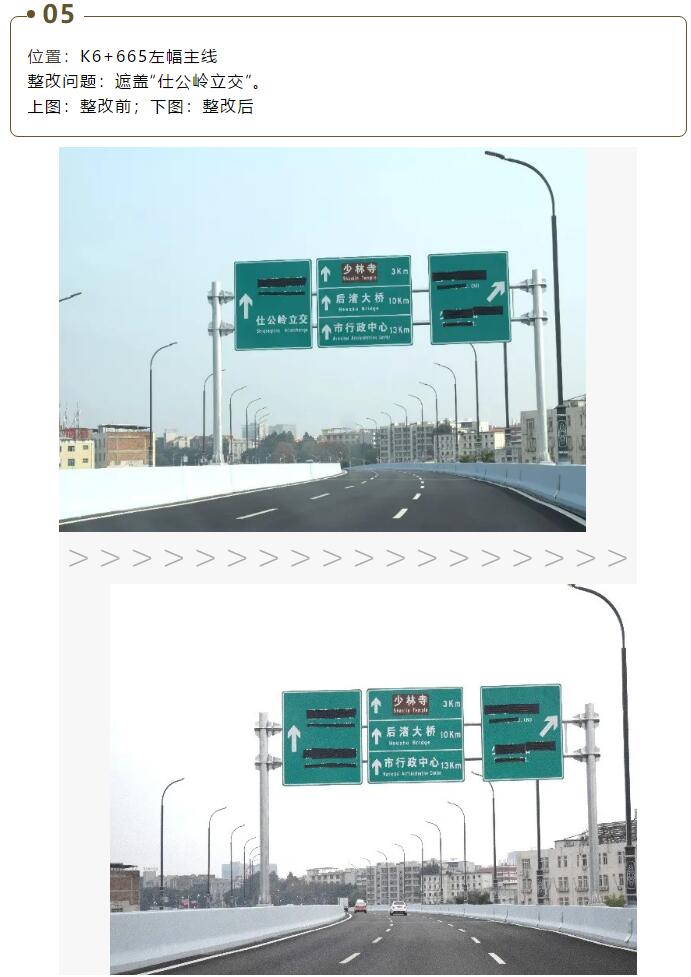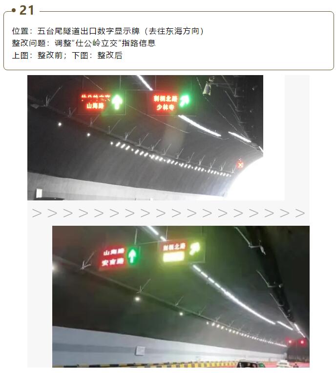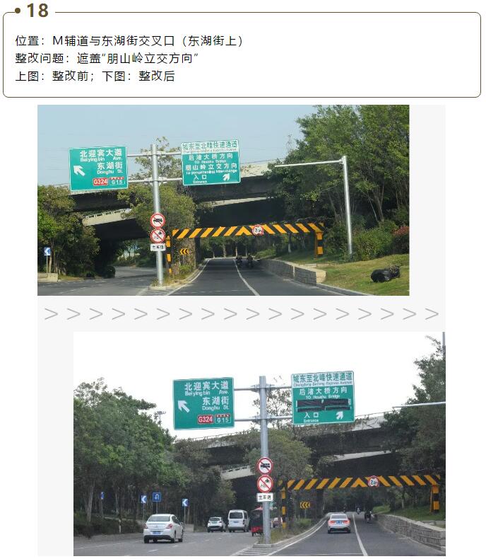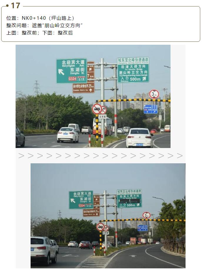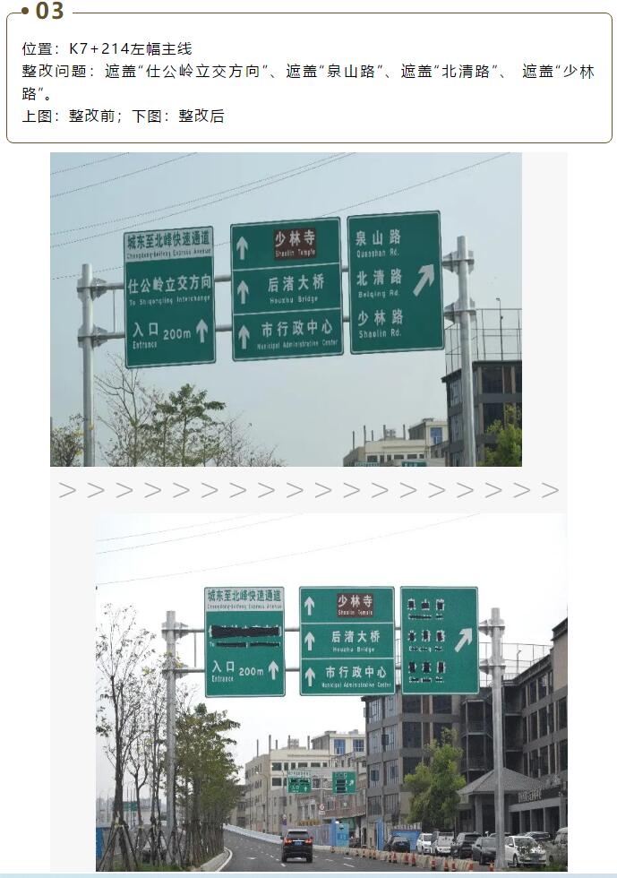 针对市民反映的问题,泉州市城东至北峰快速通道项目建设指挥部高度重视,立即组织建设单位、施工单位对快速通道全线的标识标牌进行逐一排查,并与交警部门充分沟通,根据现场实际情况对全线23处标识标牌的内容进行了整改,整改措施主要是对标识标牌上未开通道路的名称进行遮盖、对已开通道路的名称的遮盖揭开。具体每处整改情况详见下方整改示意图所示。