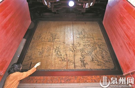 正殿后方,有一幅清道光年间绘制的大型壁画《敕封天上圣母图》,描绘了当时湄洲岛天后宫的建筑格局。“当年湄洲岛重修妈祖庙时,特地来此考察,借鉴了壁画里的信息,设计了湄洲妈祖庙重建的格局。”工作人员介绍,湄洲岛是妈祖的出生地,曾经隶属泉州管辖,绘制湄洲妈祖庙风光壁画,既表达对妈祖出生地的尊敬,又借助泉州港重要的海交地位及泉州天后宫的文化影响力,增加妈祖信仰文化的传播。