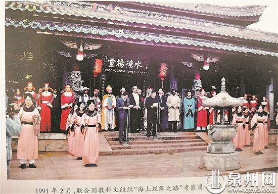 1991年2月,联合国教科文组织“海上丝绸之路”考察团考察泉州天后宫。(翻拍)