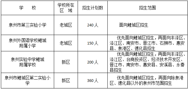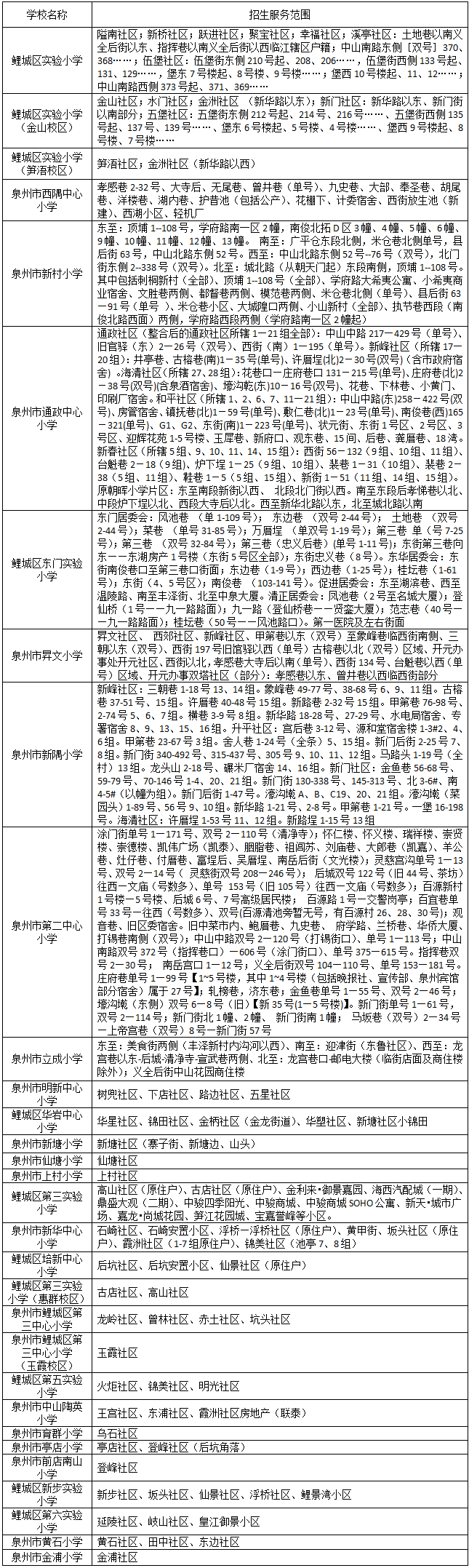 泉州市鲤城区公办小学招生服务范围