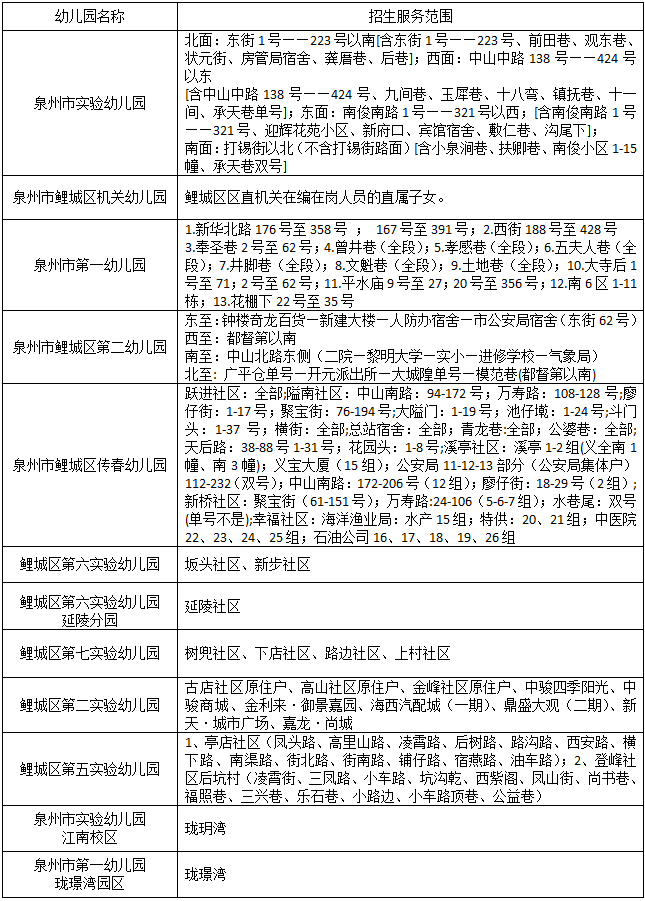 泉州市鲤城区公办幼儿园招生服务范围