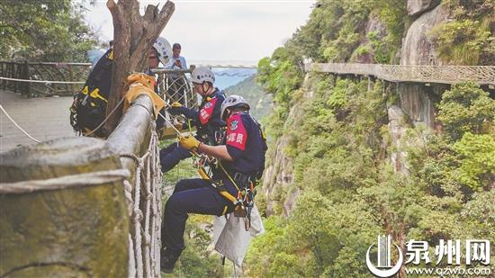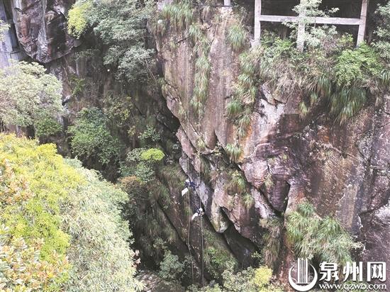 泉州网4月7日讯(记者陈明华 通讯员黄珍珍 文/图)身系安全绳,索降到落差300多米的悬崖峭壁上,对景区易脱落石块区域进行安全隐患排查,清理掉落悬崖间的垃圾。近日,11名身穿蓝色救援服、头戴白色头盔的泉州阳光救援中心队员,来到德化石牛山景区开展“净山”行动。
