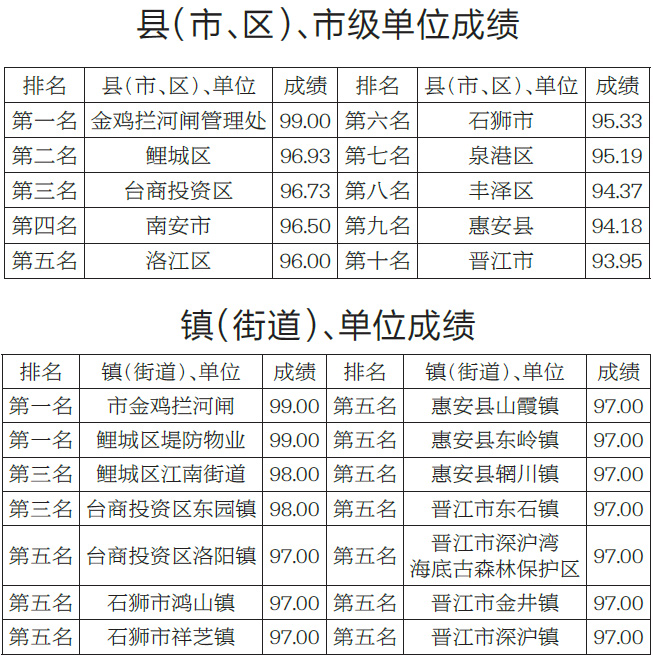 泉州网4月8日讯 (记者吴志明 通讯员邱一漫)2月份,市城市管理综合考评中心对全市海岸带(近岸海域和海岸线向陆一侧200米的陆域)和晋江入海口至金鸡拦河闸上游100米的晋江河道环境卫生情况进行考评。其中,在各县(市、区)、市级单位中,金鸡拦河闸管理处再次夺魁,晋江市倒数第一。而从各镇(街道)、单位成绩来看,市金鸡拦河闸、鲤城区堤防物业并列第一,台商投资区洛阳镇、石狮市鸿山镇等十个乡镇并列第五名。(具体成绩详见下图)