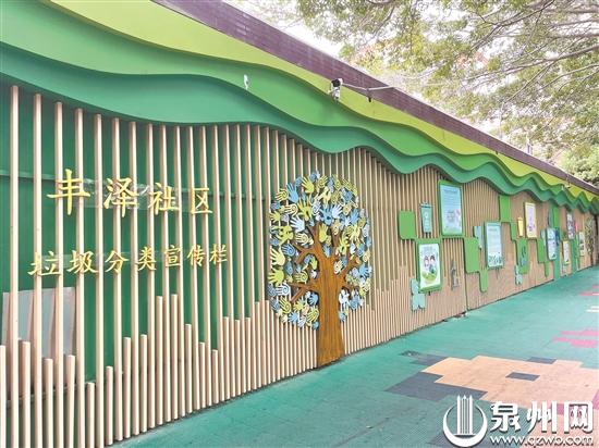 走进丰泽新村,四周绿意盎然,不少老人小孩正在小区公园内游玩散步。记者看到,小区路面干净整洁,垃圾投放点设置得当,还有一整面墙被绘制成垃圾分类宣传栏,环保概念深入人心。