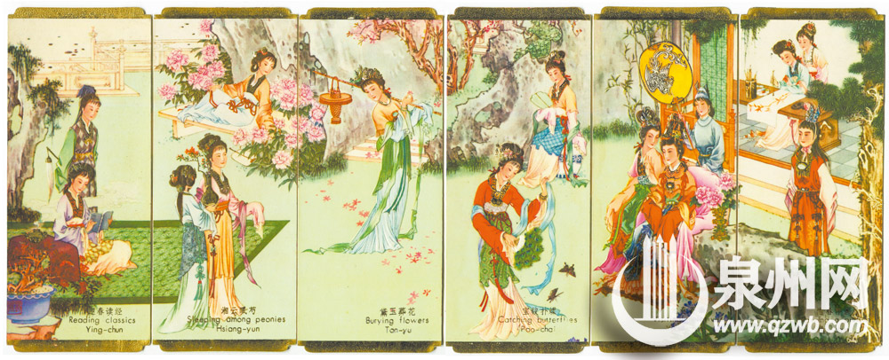 童年时代,朱彩云祖父的书桌紧挨的那面墙上,悬挂着大大小小的相框,居中的是祖母的照片,周边有一些老照片,一些海外侨亲的照片,以及祖父的儿孙们的照片,还有一个放置比较低的相框,里面是一排红楼梦年历卡。这套年历卡,6枚连成一幅画,依次为迎春读经、湘云眠芍、黛玉葬花、宝钗扑蝶、元春省亲、惜春作画,画面中,不仅金陵十二钗全了,还有贾宝玉。不知多少次,她仰视镜框里精致的年历卡,时光宛若静止了。