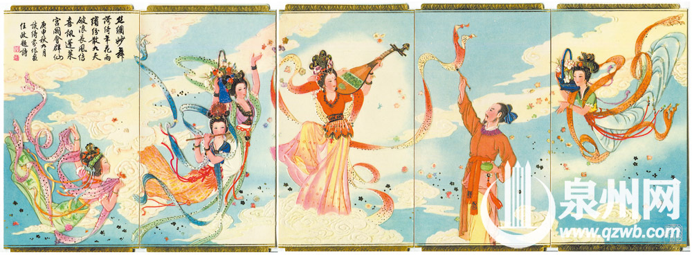《丝绸妙舞》一套5枚,一画师作画,在他笔下,天女散花、飞天乐舞……落款题诗“落绮年花雨,缤纷散九天,破浪长风,传喜讯,蓬莱宫阙会群仙。”