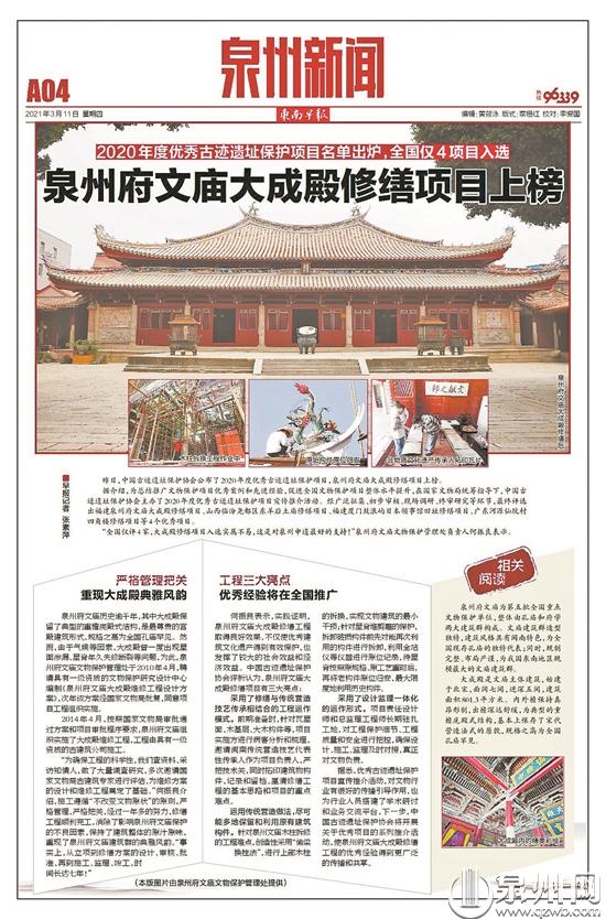 据介绍,泉州府文庙是第五批全国重点文物保护单位,大成殿是其主体建筑,2014年启动保护性修缮工程,2015年基本完工。大成殿修缮工程按照原形制、原结构、原材料、原工艺要求,尽可能保存原构件,尽可能真实完整地保存历史信息和建筑风貌。