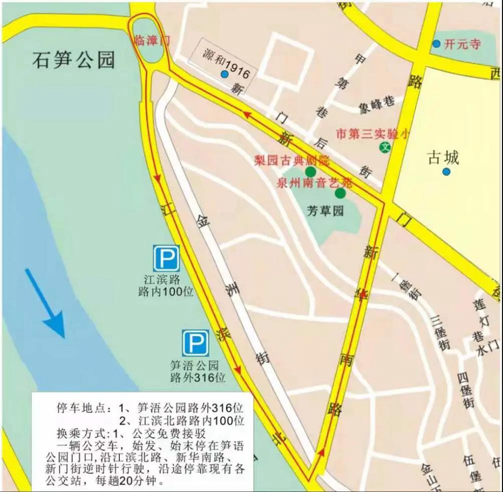 公交公司将安排一辆公交车沿笋浯公园门口-江滨北路-新华南路-新门街-笋浯公园门口的路线逆时针行驶,沿途停靠现有公交站,每趟20分钟。
