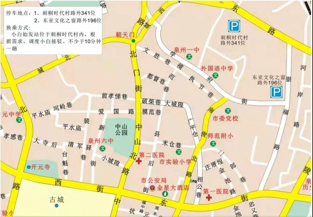 换乘方式:可前往位于刺桐时代村内的小白始发站换乘小白接驳车进入古城区。公交公司将根据需求调度小白接驳,不少于10分钟一趟。