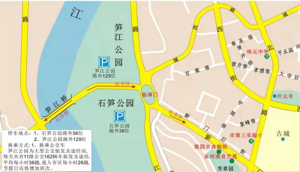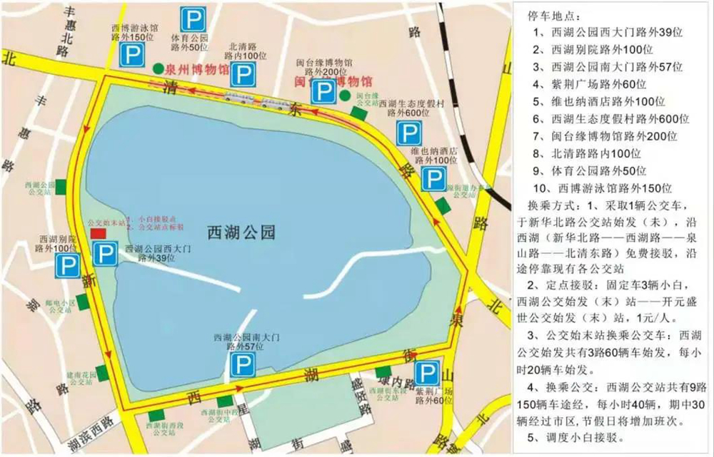 二、为避免古城区道路拥堵,节假日期间试行P+R交通模式(“P+R”全称“Park + Ride”,即“停车与换乘”模式),前往古城区车辆建议停放在外围停车场内,再乘坐公交车、小白接驳车、公共自行车等公共交通工具进入古城。经鲤城交警与公交公司协调,节假日期间将增设公交及小白线路班次并提供部分免费接驳线路,以满足市民群众出行需要。