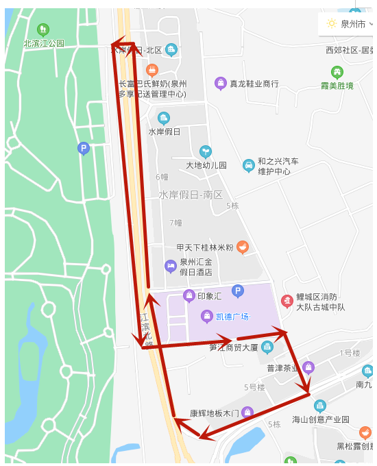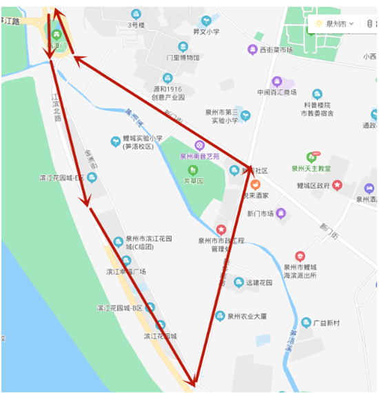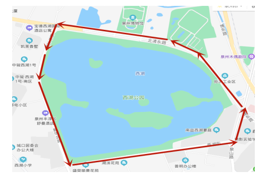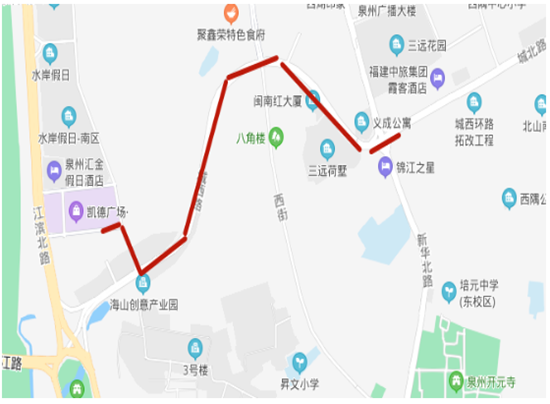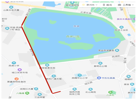 西湖公园-新华北路(邮电公寓、建南花园)-西湖街(西湖街西段、西湖街中段、西湖街东段)-泉山路(泉山路南段)-北清东路(清源街道办事处)-北清东路(闽台缘博物馆、泉州博物馆)-新华北路-西湖公园