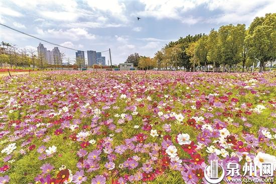 昨日,记者途经市区丰海路法石路段,被长春妈祖宫附近的波斯菊花海吸引。据观察,这片花海尚未完全怒放,“五一”假期应是观赏佳期,市民、游客如到附近游玩,可顺道赏花。(陈起拓 摄)