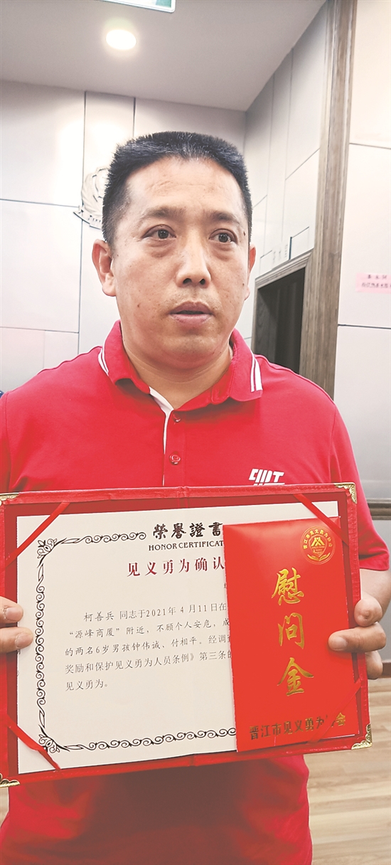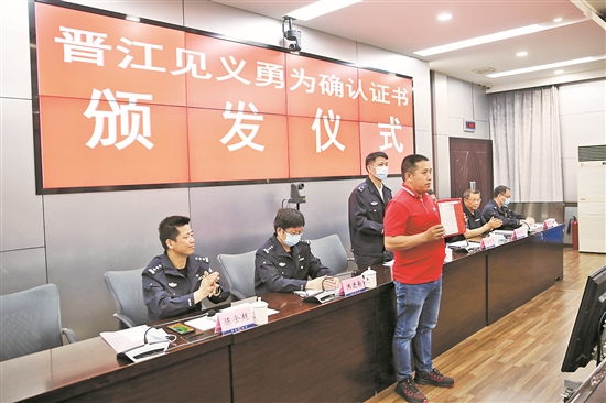 泉州网4月28日讯(记者 张晓明 黄祖祥 通讯员 张金坛 文/图)4月11日中午,2名儿童不慎落水,危急之际,路过的柯善兵毫不犹豫跳入水中将他们救起,挽救了孩子们的生命。昨日,晋江市公安局举行见义勇为确认证书颁发仪式,柯善兵被确认为“见义勇为”人员。