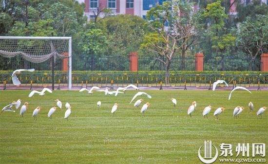 不少牛背鹭停在校园足球场上 (张逸 供图)