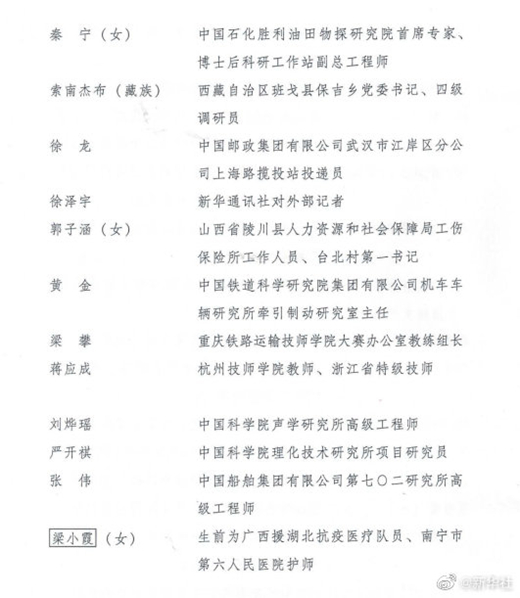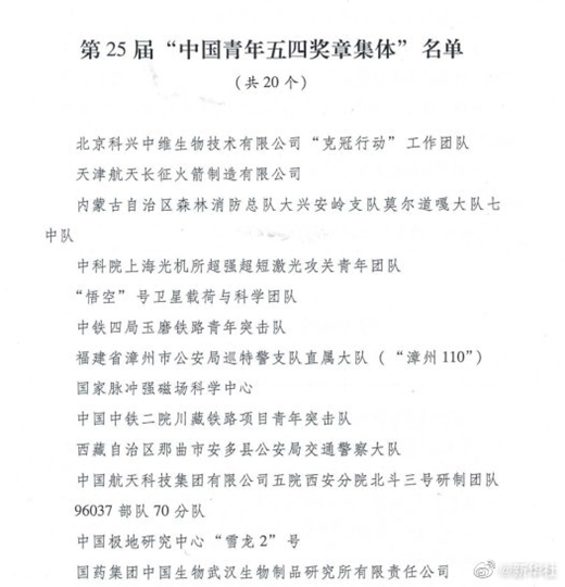 在五四青年节来临之际,共青团中央、全国青联共同颁授第25届“中国青年五四奖章”,表彰青年中的优秀典型和模范代表。决定授予王殳凹等30名同志第25届“中国青年五四奖章”,授予北京科兴中维生物技术有限公司“克冠行动”工作团队等14个青年集体第25届“中国青年五四奖章集体”。确认新时代卫国戍边英雄群体等6个青年集体获第25届“中国青年五四奖章集体”、刘烨瑶等4名同志获第25届“中国青年五四奖章”。(记者黄玥)
