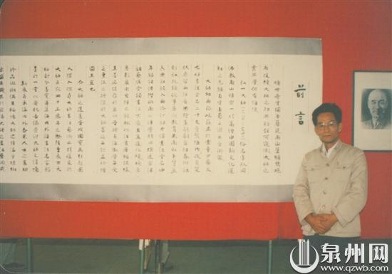 1987年,林汉宗在“纪念弘一大师圆寂名家邀请展”留影,背后为其书写的前言。