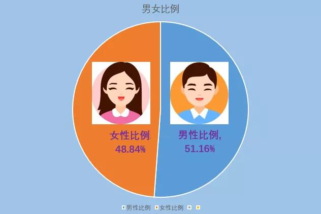 全区常住人口中,男性人口为202637人,占51.16%;女性人口为193475人,占48.84%。常住人口性别比(以女性为100,男性对女性的比例)为104.74,与2010年第六次全国人口普查相比提高0.78。