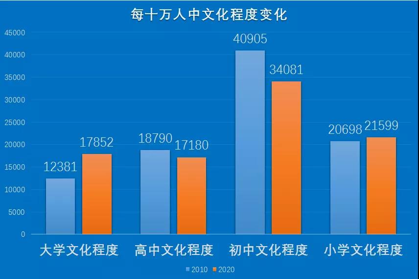 全区常住人口中,拥有大学(指大专及以上)文化程度的人口为70713人;拥有高中(含中专)文化程度的人口为68054人;拥有初中文化程度的人口为134999人;拥有小学文化程度的人口为85558人(以上各种受教育程度的人包括各类学校的毕业生、肄业生和在校生)。与2010年第六次全国人口普查相比,每10万人中拥有大学文化程度的由12381人上升为17852人;拥有高中文化程度的由18790人下降为17180人;拥有初中文化程度的由40905人下降为34081人;拥有小学文化程度的由20698人上升为21599人。