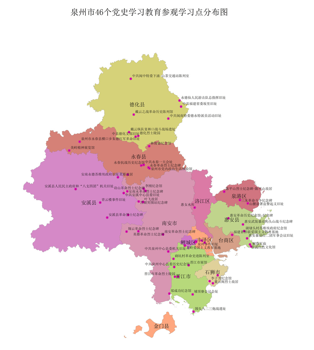 泉州网6月3日讯(记者吴丽娇 通讯员蔡东)近日,为方便广大党员和群众了解党史学习教育参观学习点的分布情况,泉州市资源规划局发挥测绘数据优势,以泉州市普通地图为底板,在泉州市已公布的46个党史学习教育参观学习点的基础上,制作完成了党史学习教育基地专题图,直观呈现泉州市重要的“红色根脉”。